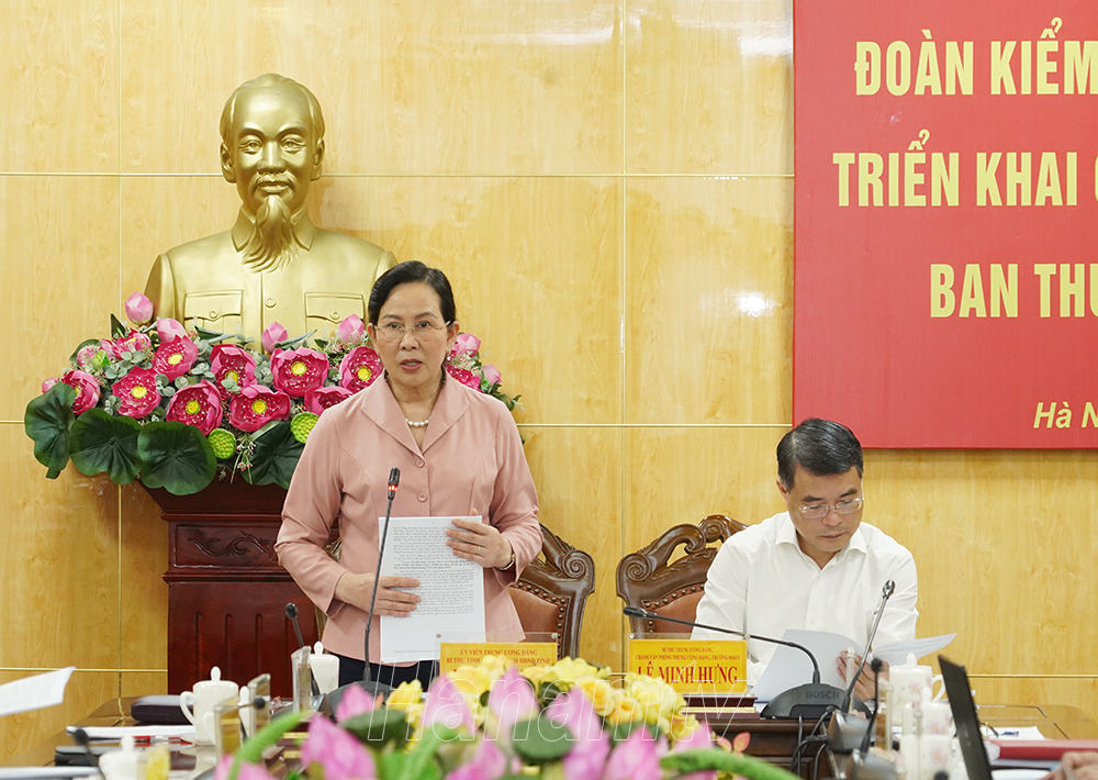 Đồng chí Lê Thị Thủy, Ủy viên Trung ương Đảng, Bí thư Tỉnh ủy, Chủ tịch HĐND tỉnh khẳng định cuộc kiểm tra là cơ hội tốt để tỉnh Hà Nam báo cáo với Bộ Chính trị, Ban Bí thư về những kết quả đạt được, những hạn chế trong công tác lãnh đạo, chỉ đạo và tổ chức thực hiện Kết luận số 21-KL/TW gắn với việc lãnh đạo, chỉ đạo thực hiện Chỉ thị số 26-CT/TW. Những nội dung kiểm tra, kết luận kiểm tra là cơ sở quan trọng để BTV Tỉnh ủy từng bước hoàn thiện công tác lãnh, chỉ đạo; không ngừng đổi mới, sáng tạo trong công tác kiểm tra của Đảng.