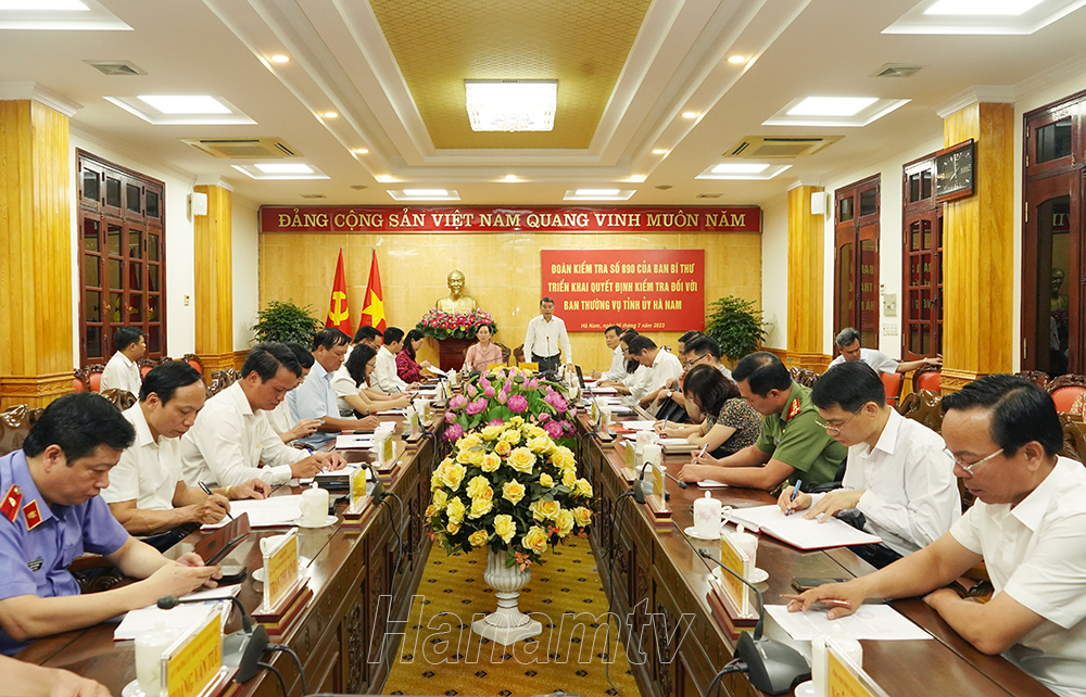 Tại buổi làm việc, đại diện Đoàn kiểm tra đã công bố Quyết định và Kế hoạch kiểm tra đối với BTV Tỉnh ủy Hà Nam. Nội dung kiểm tra là kết quả việc lãnh đạo, chỉ đạo và tổ chức thực hiện Kết luận số 21-KL/TW ngày 25/10/2021 của Ban Chấp hành Trung ương Đảng khóa XIII về đẩy mạnh xây dựng, chỉnh đốn Đảng và hệ thống chính trị; kiên quyết ngăn chặn, đẩy lùi, xử lý nghiêm cán bộ, đảng viên suy thoái về tư tưởng chính trị, đạo đức, lối sống, biểu hiện "tự diễn biến", "tự chuyển hóa"; tập trung vào nội dung đẩy mạnh đấu tranh, phòng, chống tham nhũng, lãng phí, tiêu cực, gắn với việc lãnh đạo, chỉ đạo thực hiện Chỉ thị số 26-CT/TW ngày 9/11/2018 của Bộ Chính trị về tăng cường sự lãnh đạo của Đảng đối với các cơ quan bảo vệ pháp luật trong công tác điều tra, xử lý các vụ án, vụ việc phức tạp, dư luận quan tâm.