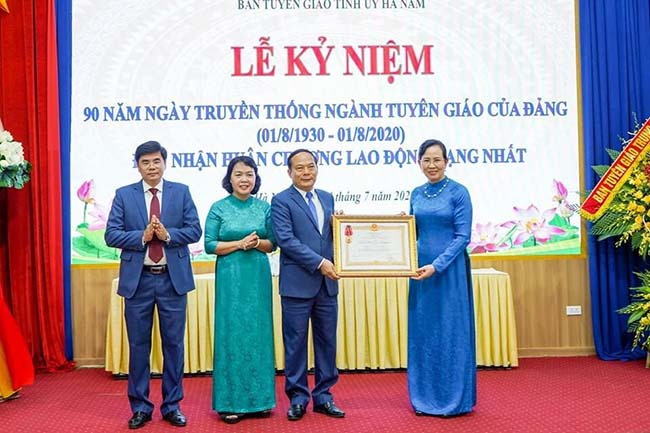 Đồng chí Lê Thị Thủy, Ủy viên TW Đảng, Bí thư Tỉnh ủy thừa ủy quyền của Chủ tịch nước trao Huân chương Lao động hạng Nhất cho Ban Tuyên giáo Tỉnh ủy Hà Nam nhân dịp kỷ niệm 90 năm ngày truyền thống ngành Tuyên giáo Theo đồng chí Trần Đức Thuần, Ủy viên Ban Thường vụ, Trường Ban Tuyên giáo Tỉnh ủy, mục tiêu, nhiệm vụ của công tác tuyên giáo trên địa bàn tỉnh trong thời gian tới là tiếp tục góp phần tích cực vào việc tuyên truyền, bảo vệ, phát triển sáng tạo chủ nghĩa Mác – Lênin, tư tưởng Hồ Chí Minh, đường lối, chủ trương của Đảng, chính sách, pháp luật của Nhà nước; trước mắt là tập trung tuyên truyền thành công Đại hội đảng bộ các cấp, Đại hội đảng bộ tỉnh Hà Nam lần thứ XX và Đại hội XIII của Đảng. Cổ vũ toàn Đảng, toàn dân thực hiện thắng lợi sự nghiệp đổi mới, đẩy mạnh công nghiệp hoá, hiện đại hoá, hội nhập kinh tế quốc tế. Tham gia tích cực có hiệu quả vào cuộc vận động xây dựng chỉnh đốn Đảng, nâng cao năng lực lãnh đạo và sức chiến đấu của Đảng, xây dựng Đảng vững mạnh về chính trị, tư tưởng, tổ chức, giữ vững và mở rộng trận địa tư tưởng của Đảng.
