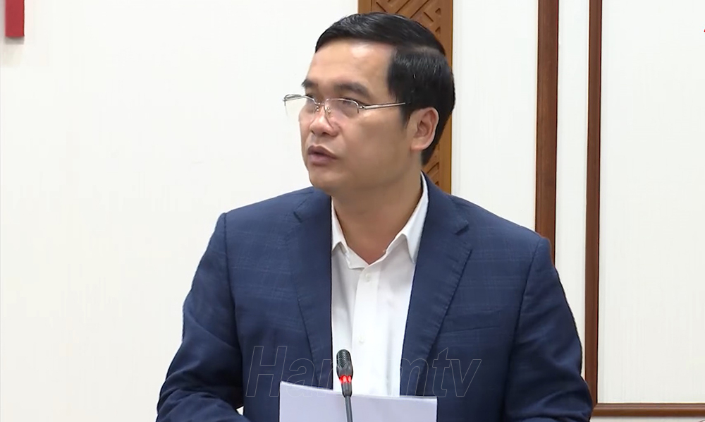 Giám đốc Sở Kế hoạch và Đầu tư Nguyễn Văn Lượng trình bày báo cáo thực hiện Nghị quyết Nghị quyết số 12- NQ/TU ngày 15/9/2021 của Tỉnh ủy về đẩy mạnh phát triển thương mại dịch vụ trọng tâm là du lịch và logistics tỉnh Hà Nam giai đoạn 2021 -2025, định hướng đến năm 2030