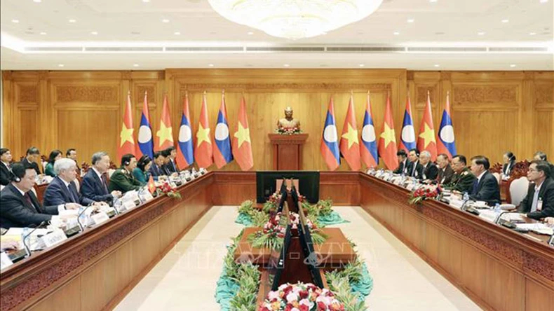 Chủ tịch nước Tô Lâm hội đàm với Tổng Bí thư, Chủ tịch nước Lào Thongloun Sisoulith. (Ảnh: NHAN SÁNG/TTXVN)
